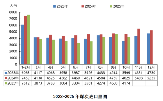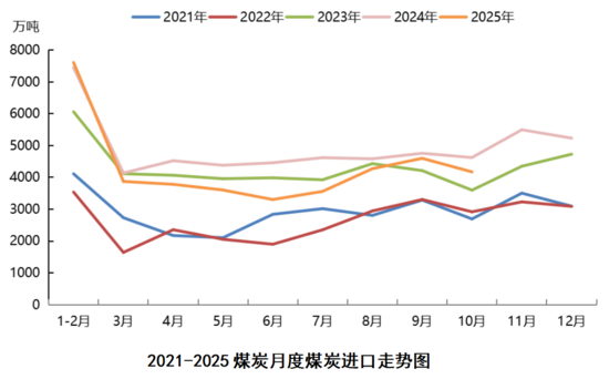 根據(jù)國家海關(guān)總署公布的最新數(shù)據(jù)顯示,2025年10月份,我國進口煤炭4173.7萬噸,較去年同期的4624.8萬噸減少451.1萬噸,降幅為9.8%;較9月份的4600.3萬噸減少426.6萬噸,降幅為9.3%。2025年1-10月份,全國共進口煤炭38762.3萬噸,同比下降11%。從單月數(shù)據(jù)來看,10月進口量結(jié)束了自7月以來連續(xù)三月環(huán)比增加的態(tài)勢。