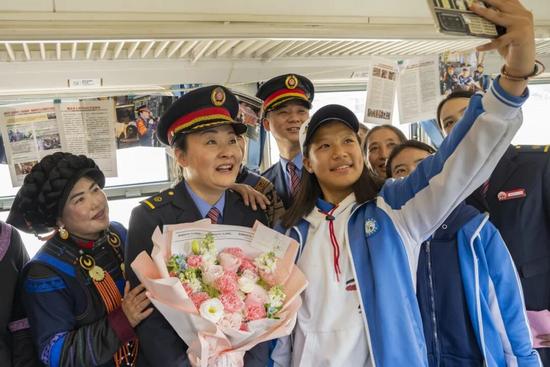 列車行進間,阿西阿呷的徒弟吉布日哈將她請到一節(jié)布置一新的車廂。車窗上掛滿她多年來的工作照,特意趕來的彝族阿媽和老同事手捧鮮花等候著??吹竭@一幕,阿西阿呷流下了熱淚。