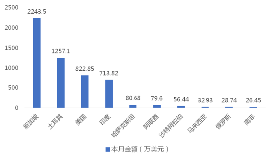 2025年10月,我國(guó)龍門(mén)式起重機(jī)出口金額排名前十位的國(guó)家/地區(qū)分別為新加坡、土耳其、美國(guó)、印度、哈薩克斯坦、阿聯(lián)酋、沙特阿拉伯、馬來(lái)西亞、俄羅斯、南非,合計(jì)占我國(guó)該產(chǎn)品出口總額的96.46%。其中,向新加坡出口最多,金額為2243.50萬(wàn)美元,占出口總額的40.51%。