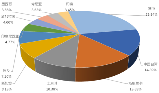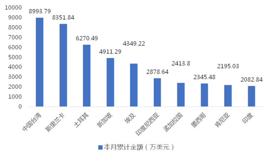 1-10月,我國(guó)龍門(mén)式起重機(jī)出口金額排名前十的國(guó)家/地區(qū)分別為中國(guó)臺(tái)灣、斯里蘭卡、土耳其、新加坡、埃及、印度尼西亞、孟加拉國(guó)、墨西哥、肯尼亞、印度,合計(jì)占我國(guó)該產(chǎn)品出口總額的74.18%。其中,向中國(guó)臺(tái)灣出口最多,金額為8993.79萬(wàn)美元,占出口總額的14.89%。