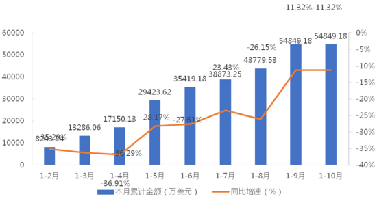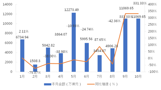 1-10月,我國(guó)龍門(mén)式起重機(jī)累計(jì)出口金額為60387.41萬(wàn)美元,同比下降10.51%;累計(jì)出口數(shù)量為4081臺(tái),同比增長(zhǎng)36.58%;出口均價(jià)為14.80萬(wàn)美元/臺(tái),同比下降34.46%。