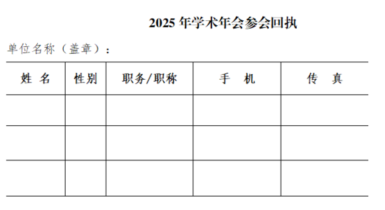 請參會人員填寫回執(zhí)(見下表),12日前發(fā)傳真至學(xué)會辦公室,或發(fā)送電子郵件至學(xué)會郵箱,以方便統(tǒng)一安排食宿。