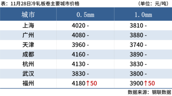 冷軋板卷:11月28日,全國24個主要城市1.0mm冷卷均價3902元/噸,較上個交易日漲2元/噸。黑色期貨盤面探漲,小部分地區(qū)因鋼廠調(diào)價,價格出現(xiàn)上漲,整體市場價格還是以穩(wěn)為主。據(jù)部分貿(mào)易商反饋,雖期貨出現(xiàn)上漲,但市場處于需求淡季,下游終端表現(xiàn)一般,市場貿(mào)易商操作多以出貨為主,成交仍有暗降空間,日內(nèi)市場成交表現(xiàn)不溫不火,預計下周全國冷軋板卷價格或?qū)⒈P整運行為主。