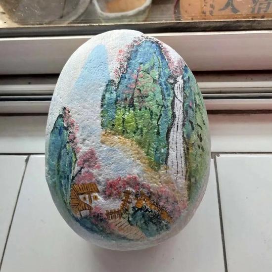 畫(huà)好石頭畫(huà),合適的石頭是基礎(chǔ)。因此,為了找到形態(tài)、紋路都合心意的石頭,張娜一有空就走遍周邊河灘。不同形狀、紋理的石頭,適配不同創(chuàng)作主題。扁平的石頭表面平整,適合描繪寧?kù)o的風(fēng)景畫(huà)面,無(wú)論是山間的層巒疊嶂,還是河邊的垂柳依依,都能在上面清晰展現(xiàn);圓潤(rùn)的石頭弧度柔和,被她繪成可愛(ài)的京劇臉譜、憨態(tài)可掬的小動(dòng)物和色彩鮮艷的水果,每一個(gè)形象都生動(dòng)逼真。