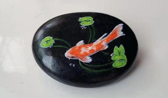 張娜對(duì)石頭畫(huà)的喜愛(ài),始于兒時(shí)一次偶然的相遇。她隨著父母一起到河邊散步,河灘上散落的各色石頭瞬間吸引了張娜的目光。那些石頭形態(tài)各異,仿佛每一塊都藏著獨(dú)一無(wú)二的韻味,她指尖摩挲著表面的紋路,看著紋路在陽(yáng)光下呈現(xiàn)出的奇妙光影,腦海中突然浮現(xiàn)出一幅小魚(yú)游水的畫(huà)面。平時(shí)喜愛(ài)畫(huà)畫(huà)的她,當(dāng)即萌生了“在石頭上作畫(huà)”的想法。