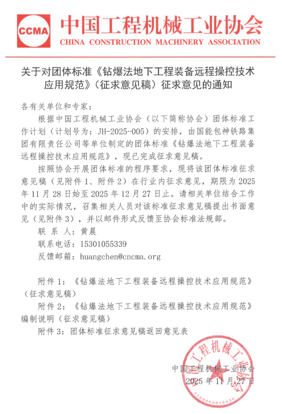 根據(jù)中國(guó)工程機(jī)械工業(yè)協(xié)會(huì)(以下簡(jiǎn)稱協(xié)會(huì))團(tuán)體標(biāo)準(zhǔn)工作計(jì)劃(計(jì)劃號(hào)為:JH-2025-005)的安排,由國(guó)能包神鐵路集團(tuán)有限責(zé)任公司等單位制定的團(tuán)體標(biāo)準(zhǔn)《鉆爆法地下工程裝備遠(yuǎn)程操控技術(shù)應(yīng)用規(guī)范》,現(xiàn)已完成征求意見(jiàn)稿。