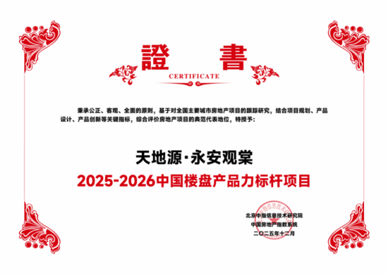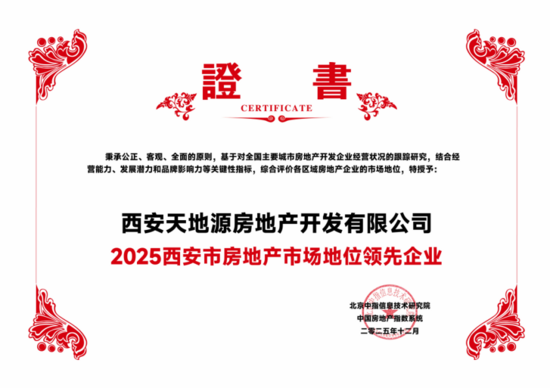 12月11日,由北京中指信息技術研究院主辦,中國房地產指數系統、中國物業服務指數系統承辦的“2025中國房地產大數據年會暨2026中國房地產市場趨勢報告會”在北京召開。西安天地源房地產開發有限公司憑借較強的經營能力和發展潛力,獲評“2025西安市房地產市場地位領先企業”,永安觀棠項目同時榮獲“2025-2026中國樓盤產品力標桿項目”。