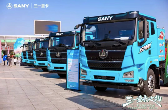 賽場外,10臺三一重卡組成鋼鐵方陣霸氣進駐婁底體育中心,江山平頂425、高頂425、SE588三款硬核車型列隊迎賓,氣場全開為賽事護航,成了耀眼的天海藍風景線。