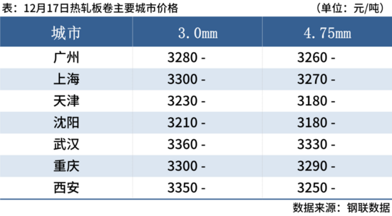 熱軋板卷:12月17日,全國24個主要城市4.75mm熱軋板卷均價3288元/噸,較上個交易日持平。終端需求偏弱,整體出貨不暢,加之多地啟動重污染預警,供應方面預期或受影響。綜合來看,傳統消費淡季,鋼廠接單壓力顯著,疊加近期寒潮影響,施工受限,需求持續下降,價格承壓,預計18日熱軋板卷價格或弱勢盤整運行。