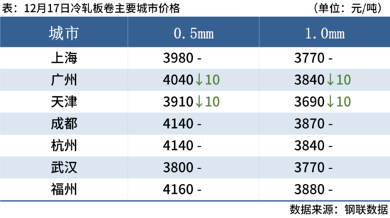 冷軋板卷:12月17日,全國24個主要城市1.0mm冷卷均價3878元/噸,較上個交易日/噸。北方市場已經進入需求淡季,現貨市場商家為保成交只能降價銷售,議價空間有增加,終端客戶采購較為謹慎,市場整體成交氛圍一般,北方區域大戶日度成交700噸。心態方面來看,需求釋放速度緩慢,貿易商對后市行情持謹慎觀望心態為主,需關注北方地區資源投放到南方的情況,預計18日冷軋價格或將持續窄幅震蕩運行為主。
