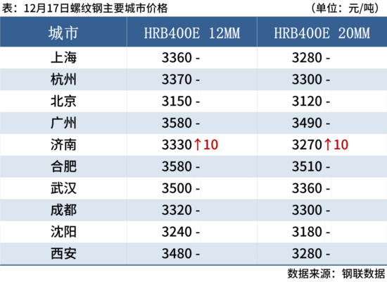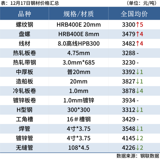 螺紋鋼:12月17日全國31個主要城市20mm三級抗震螺紋鋼均價3300元/噸,較上個交易日漲5元/噸。目前市場需求延續弱勢,淡季特征明顯,考慮到產量的快速下滑,整體庫存維持去化,基本面矛盾并不顯著預計18日國內建筑鋼材價格或將窄幅震蕩為主。
