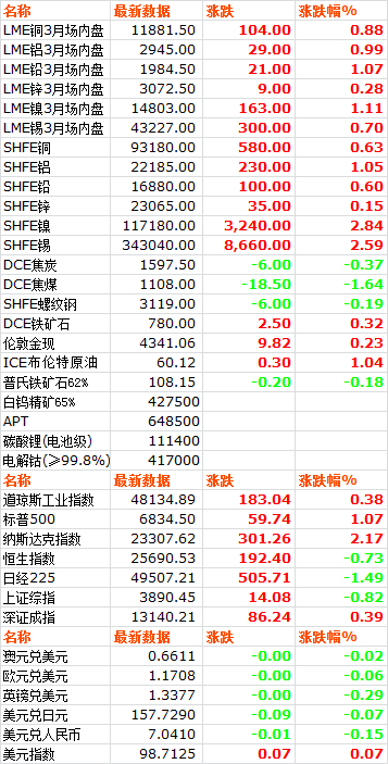 1219日,LME六種基本金屬價(jià)格全線上漲。三月期銅價(jià)收于11881.5美元噸,上漲0.88%。三月期鋁價(jià)收于2945美元噸,上漲0.99%。三月期鉛價(jià)收于1984.5美元噸,上漲1.07%。三月期鋅價(jià)收于3072.5美元噸,上漲0.28%。三月期錫價(jià)收于43227美元噸,上漲0.70%。三月期鎳價(jià)收于14803美元噸,上漲1.11%
