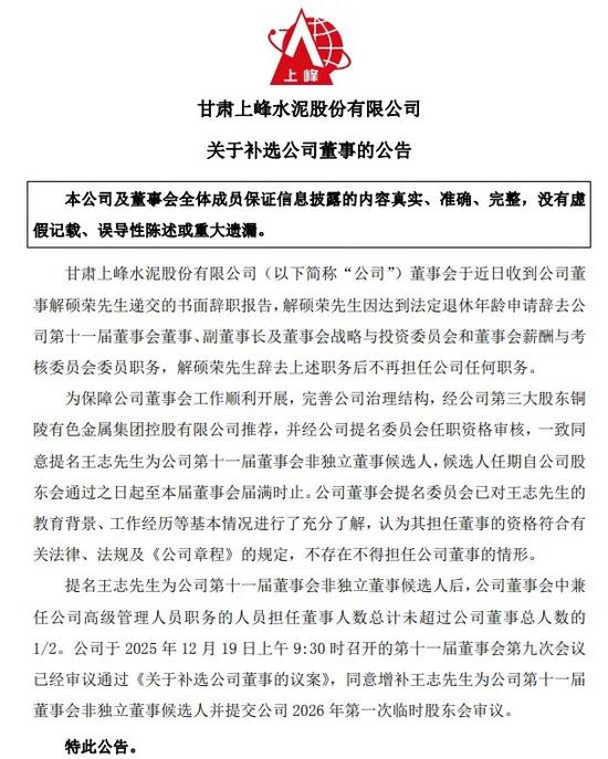 近日,上峰水泥發布《關于補選公司董事的公告》顯示,公司董事會于近日收到公司董事解碩榮先生遞交的書面辭職報告,解碩榮先生因達到法定退休年齡申請辭去公司第十一屆董事會董事、副董事長及董事會戰略與投資委員會和董事會薪酬與考核委員會委員職務,解碩榮先生辭去上述職務后不再擔任公司任何職務