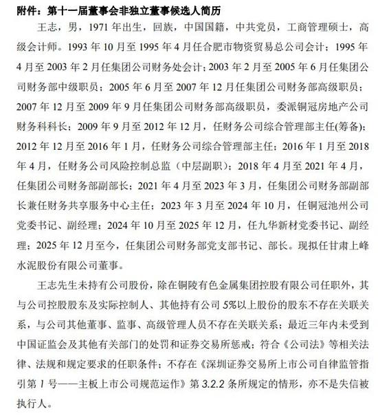 為保障公司董事會工作順利開展,完善公司治理結構,經公司第三大股東銅陵有色金屬集團控股有限公司推薦,并經公司提名委員會任職資格審核,一致同意提名王志先生為公司第十一屆董事會非獨立董事候選人,候選人任期自公司股東會通過之日起至本屆董事會屆滿時止。